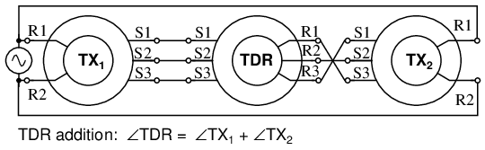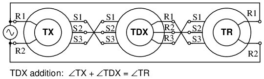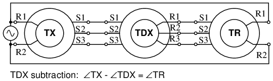 For reference we show the wiring diagrams for subtraction and addition of shaft angles using both TDX's (Torque Differential Transmitter) and TDR's (Torque Differential Receiver). The TDX has a torque angle input on the shaft, an electrical angle input on the three stator connections, and an electrical angle output on the three rotor connections. The TDR has electrical angle inputs on both the stator and rotor. The angle output is a torque on the TDR shaft. The difference between a TDX and a TDR is that the TDX is a torque transmitter and the TDR a torque receiver.
