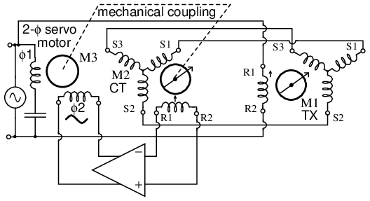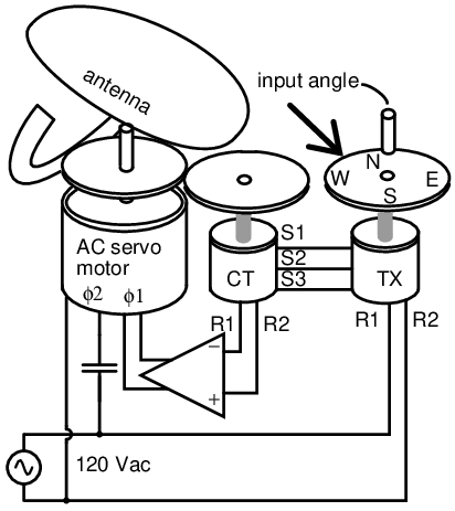 When the control transformer rotor detects a null at 90o to the axis of the stator field, there is no rotor output. Any rotor displacement produces an AC error voltage proportional to displacement. A servo (Figure above) seeks to minimize the error between a commanded and measured variable due to negative feedback. The control transformer compares the shaft angle to the stator magnetic field angle, sent by the TX stator. When it measures a minimum, or null, the servo has driven the antenna and control transformer rotor to the commanded position. There is no error between measured and commanded position, no CT, control transformer, output to be amplified. The servo motor, a 2-phase motor, stops rotating. However, any CT detected error drives the amplifier which drives the motor until the error is minimized. This corresponds to the servo system having driven the antenna coupled CT to match the angle commanded by the TX.