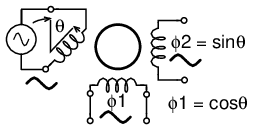 A resolver (Figure below) has two stator windings placed at 90o to each other, and a single rotor winding driven by alternating current. A resolver is used for polar to rectangular conversion. An angle input at the rotor shaft produces rectangular co-ordinates sinθ and cosθ proportional voltages on the stator windings.
