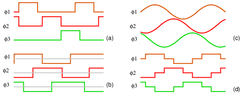 Variable reluctance motor drive waveforms: (a) unipolar wave drive, (b) bipolar full step (c) sinewave (d) bipolar 6-step.