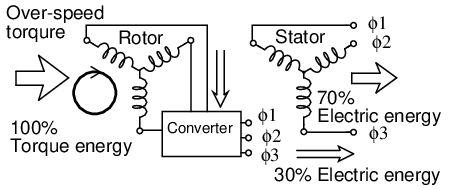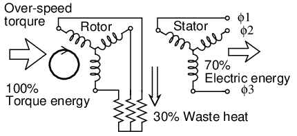If the generator over-speeds, resistance placed in the rotor circuit will absorb excess energy while the stator feeds constant 60 Hz to the power line. (Figure above) In the case of under-speed, negative resistance inserted into the rotor circuit can make up the energy deficit, still allowing the stator to feed the power line with 60 Hz power.