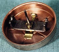 The rotor (Figure above) consists of a permanent magnet bar and a steel induction motor cup. The synchronous motor bar rotating within the pole tabs keeps accurate time. The induction motor cup outside of the bar magnet fits outside and over the tabs for self starting. At one time non-self-starting motors without the induction motor cup were manufactured.