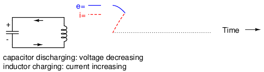 The capacitor will begin to discharge, its voltage decreasing. Meanwhile, the inductor will begin to build up a “charge” in the form of a magnetic field as current increases in the circuit: (Figure below)