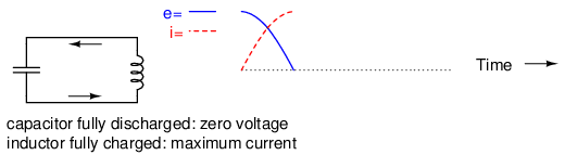Eventually the capacitor will become fully charged again as the inductor expends all of its energy reserves trying to maintain current. The voltage will once again be at its positive peak and the current at zero. This completes one full cycle of the energy exchange between the capacitor and inductor: (Figure below)