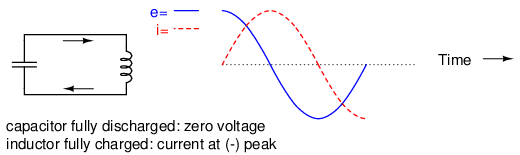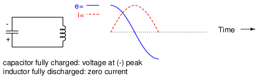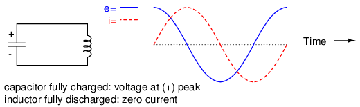 Capacitor charged: voltage at (+) peak, inductor discharged: zero current.