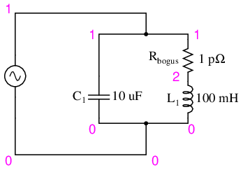 Here, an extra resistor (Rbogus) (Figure below)is necessary to prevent SPICE from encountering trouble in analysis. SPICE can't handle an inductor connected directly in parallel with any voltage source or any other inductor, so the addition of a series resistor is necessary to “break up” the voltage source/inductor loop that would otherwise be formed. This resistor is chosen to be a very low value for minimum impact on the circuit's behavior.