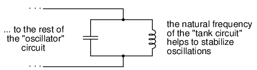 One use for resonance is to establish a condition of stable frequency in circuits designed to produce AC signals. Usually, a parallel (tank) circuit is used for this purpose, with the capacitor and inductor directly connected together, exchanging energy between each other. Just as a pendulum can be used to stabilize the frequency of a clock mechanism's oscillations, so can a tank circuit be used to stabilize the electrical frequency of an AC oscillator circuit. As was noted before, the frequency set by the tank circuit is solely dependent upon the values of L and C, and not on the magnitudes of voltage or current present in the oscillations: (Figure below)