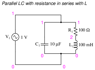 series lc circuit v1 1 0 ac 1 sin r1 1 2 1 c1 2 3 10u l1 3 0 100m .ac lin 20 100 200 .plot ac i(v1) .end