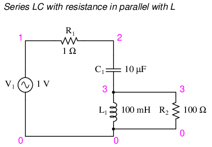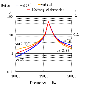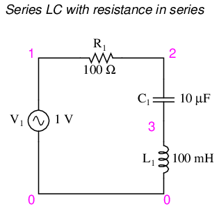 series lc circuit v1 1 0 ac 1 sin r1 1 2 1 c1 2 3 10u l1 3 0 100m .ac lin 20 100 200 .plot ac i(v1) v(2,3) v(3) .end