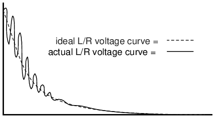 The idea of this circuit is simple: to “charge” the inductor when the switch is closed. The rate of inductor charging will be set by the ratio L/R, which is the time constant of the circuit in seconds. However, if you were to build such a circuit, you might find unexpected oscillations (AC) of voltage across the inductor when the switch is closed. (Figure below) Why is this? There's no capacitor in the circuit, so how can we have resonant oscillation with just an inductor, resistor, and battery?