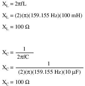 In the above circuit, we have a 10 µF capacitor and a 100 mH inductor. Since we know the equations for determining the reactance of each at a given frequency, and we're looking for that point where the two reactances are equal to each other, we can set the two reactance formulae equal to each other and solve for frequency algebraically:
