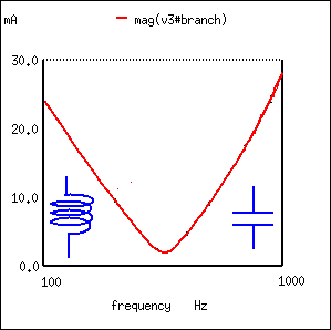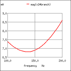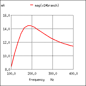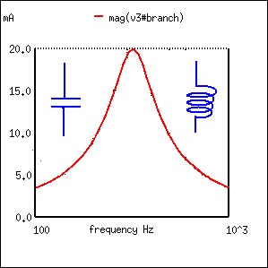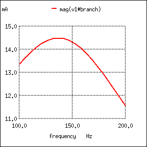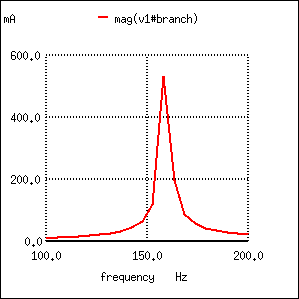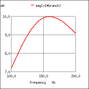 resonant circuit v1 1 0 ac 1 sin c1 1 0 10u r1 1 2 100 l1 2 0 100m .ac lin 20 100 200 .plot ac i(v1) .end