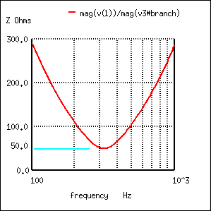 resonant circuit v1 1 0 ac 1 sin r1 1 2 1 c1 2 3 10u l1 3 0 100m r2 3 0 100 .ac lin 20 100 400 .plot ac i(v1) .end