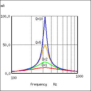The resonant current peak may be changed by varying the series resistor, which changes the Q. (Figure below) This also affects the broadness of the curve. A low resistance, high Q circuit has a narrow bandwidth, as compared to a high resistance, low Q circuit. Bandwidth in terms of Q and resonant frequency: