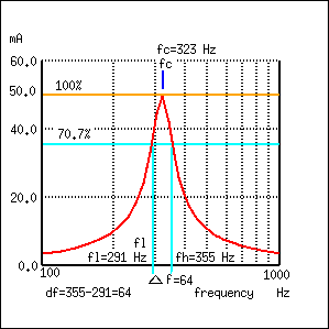 In Figure above, the 100% current point is 50 mA. The 70.7% level is 0.707(50 mA)=35.4 mA. The upper and lower band edges read from the curve are 291 Hz for fl and 355 Hz for fh. The bandwidth is 64 Hz, and the half power points are ± 32 Hz of the center resonant frequency: