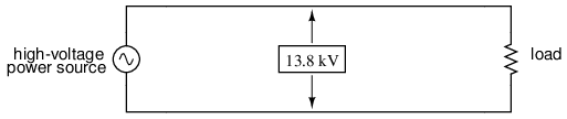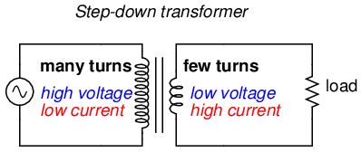 This is a very useful device, indeed. With it, we can easily multiply or divide voltage and current in AC circuits. Indeed, the transformer has made long-distance transmission of electric power a practical reality, as AC voltage can be “stepped up” and current “stepped down” for reduced wire resistance power losses along power lines connecting generating stations with loads. At either end (both the generator and at the loads), voltage levels are reduced by transformers for safer operation and less expensive equipment. A transformer that increases voltage from primary to secondary (more secondary winding turns than primary winding turns) is called a step-up transformer. Conversely, a transformer designed to do just the opposite is called a step-down transformer.