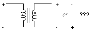 Transformers are often constructed in such a way that it is not obvious which wires lead to the primary winding and which lead to the secondary. One convention used in the electric power industry to help alleviate confusion is the use of “H” designations for the higher-voltage winding (the primary winding in a step-down unit; the secondary winding in a step-up) and “X” designations for the lower-voltage winding. Therefore, a simple power transformer will have wires labeled “H1”, “H2”, “X1”, and “X2”. There is usually significance to the numbering of the wires (H1 versus H2, etc.), which we'll explore a little later in this chapter.