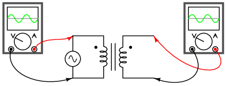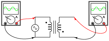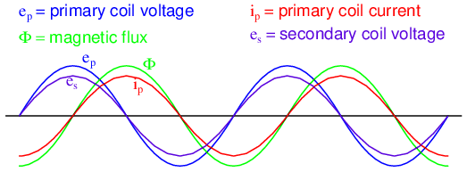 If this secondary coil experiences the same magnetic flux change as the primary (which it should, assuming perfect containment of the magnetic flux through the common core), and has the same number of turns around the core, a voltage of equal magnitude and phase to the applied voltage will be induced along its length. In the following graph, (Figure below) the induced voltage waveform is drawn slightly smaller than the source voltage waveform simply to distinguish one from the other: