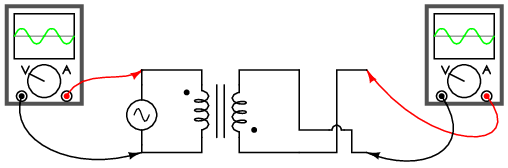 No current will exist in the secondary coil, since it is open-circuited. However, if we connect a load resistor to it, an alternating current will go through the coil, in-phase with the induced voltage (because the voltage across a resistor and the current through it are always in-phase with each other). (Figure below)
