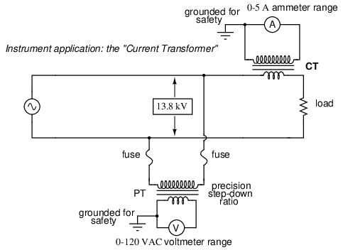 Note that with equal inductances for both windings (100 Henrys each), the AC voltages and currents are nearly equal for the two. The difference between primary and secondary currents is the magnetizing current spoken of earlier: the 90o lagging current necessary to magnetize the core. As is seen here, it is usually very small compared to primary current induced by the load, and so the primary and secondary currents are almost equal. What you are seeing here is quite typical of transformer efficiency. Anything less than 95% efficiency is considered poor for modern power transformer designs, and this transfer of power occurs with no moving parts or other components subject to wear.