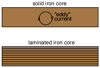 The main strategy in mitigating these wasteful eddy currents in transformer cores is to form the iron core in sheets, each sheet covered with an insulating varnish so that the core is divided up into thin slices. The result is very little width in the core for eddy currents to circulate in: (Figure below)