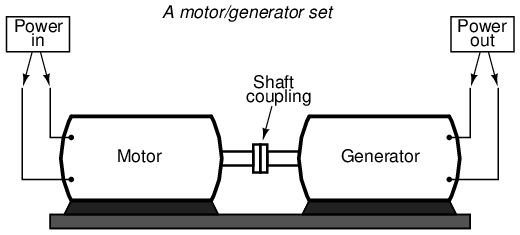 The practical significance of this is made more apparent when an alternative is considered: before the advent of efficient transformers, voltage/current level conversion could only be achieved through the use of motor/generator sets. A drawing of a motor/generator set reveals the basic principle involved: (Figure below)