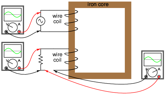 Let us now consider the same inductor device, except this time with a second coil (Figure below) wrapped around the same iron core. The first coil will be labeled the primary coil, while the second will be labeled the secondary: