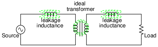 Consequently, this “leakage” flux merely stores and returns energy to the source circuit via self-inductance, effectively acting as a series impedance in both primary and secondary circuits. Voltage gets dropped across this series impedance, resulting in a reduced load voltage: voltage across the load “sags” as load current increases. (Figure below)