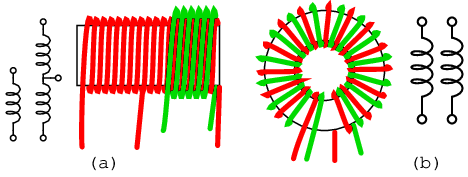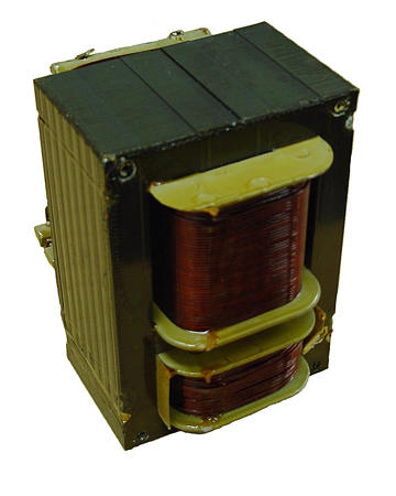 The following photograph shows a power transformer of the type used in gas-discharge lighting. Here, the two inductor coils can be clearly seen, wound around an iron core. While most transformer designs enclose the coils and core in a metal frame for protection, this particular transformer is open for viewing and so serves its illustrative purpose well: (Figure below)