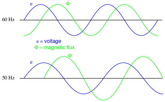 Another cause of abnormal transformer core saturation is operation at frequencies lower than normal. For example, if a power transformer designed to operate at 60 Hz is forced to operate at 50 Hz instead, the flux must reach greater peak levels than before in order to produce the same opposing voltage needed to balance against the source voltage. This is true even if the source voltage is the same as before. (Figure below)