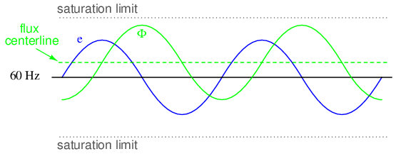 Yet another cause of transformer saturation is the presence of DC current in the primary winding. Any amount of DC voltage dropped across the primary winding of a transformer will cause additional magnetic flux in the core. This additional flux “bias” or “offset” will push the alternating flux waveform closer to saturation in one half-cycle than the other. (Figure below)