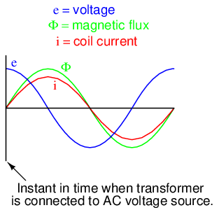 This is the mechanism causing inrush current in a transformer's primary winding when connected to an AC voltage source. As you can see, the magnitude of the inrush current strongly depends on the exact time that electrical connection to the source is made. If the transformer happens to have some residual magnetism in its core at the moment of connection to the source, the inrush could be even more severe. Because of this, transformer overcurrent protection devices are usually of the “slow-acting” variety, so as to tolerate current surges such as this without opening the circuit.