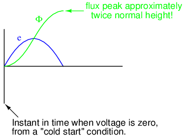 A significant difference exists, however, between continuous-mode operation and the sudden starting condition assumed in this scenario: during continuous operation, the flux and current levels were at their negative peaks when voltage was at its zero point; in a transformer that has been sitting idle, however, both magnetic flux and winding current should start at zero. When the magnetic flux increases in response to a rising voltage, it will increase from zero upward, not from a previously negative (magnetized) condition as we would normally have in a transformer that's been powered for awhile. Thus, in a transformer that's just “starting,” the flux will reach approximately twice its normal peak magnitude as it “integrates” the area under the voltage waveform's first half-cycle: (Figure below)