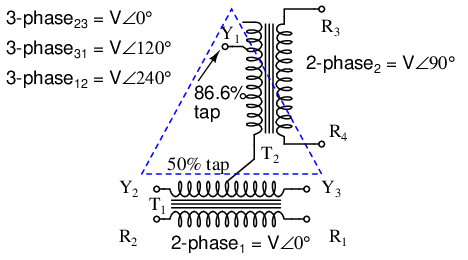 The Scott-T transformer set, Figure above, consists of a center tapped transformer T1 and an 86.6% tapped transformer T2 on the 3-φ side of the circuit. The primaries of both transformers are connected to the 2-φ voltages. One end of the T2 86.6% secondary winding is a 3-φ output, the other end is connected to the T1 secondary center tap. Both ends of the T1 secondary are the other two 3-φ connections.
