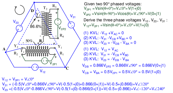 In Figure above we graphically show the 2-φ vectors at (a). At (b) the vectors are scaled by transformers T1 and T2 to 0.5 and 0.866 respectively. At (c) 1∠120o = -0.5∠0o + 0.866∠90o, and 1∠240o = -0.5∠0o - 0.866∠90o. The three output phases are 1∠120o and 1∠240o from (c), along with input 1∠0o (a).