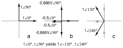 We show “DC” polarities all over this AC only circuit, to keep track of the Kirchhoff voltage loop polarities. Subtracting ∠0o is equivalent to adding ∠180o. The bottom line is when we add 86.6% of ∠90o to 50% of ∠180o we get ∠120o. Subtracting 86.6% of ∠90o from 50% of ∠180o yields ∠-120o or ∠240o.