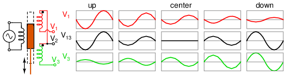 The excitation voltage is in the range of 0.5 to 10 VAC at a frequency of 1 to 200 Khz. A ferrite core is suitable at these frequencies. It is extended outside the body by an non-magnetic rod. As the core is moved toward the top winding, the voltage across this coil increases due to increased coupling, while the voltage on the bottom coil decreases. If the core is moved toward the bottom winding, the voltage on this coil increases as the voltage decreases across the top coil. Theoretically, a centered slug yields equal voltages across both coils. In practice leakage inductance prevents the null from dropping all the way to 0 V.