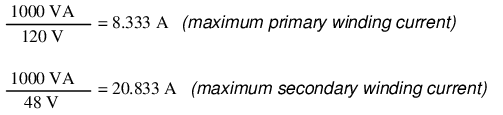 Respecting these limitations, transformers are rated for certain levels of primary and secondary winding voltage and current, though the current rating is usually derived from a volt-amp (VA) rating assigned to the transformer. For example, take a step-down transformer with a primary voltage rating of 120 volts, a secondary voltage rating of 48 volts, and a VA rating of 1 kVA (1000 VA). The maximum winding currents can be determined as such: