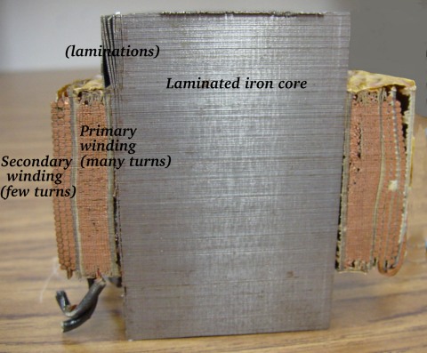In the next photograph, Figure below, a transformer is shown cut in half, exposing the cross-section of the iron core as well as both windings. Like the transformer shown previously, this unit also utilizes primary and secondary windings of differing turn counts. The wire gauge can also be seen to differ between primary and secondary windings. The reason for this disparity in wire gauge will be made clear in the next section of this chapter. Additionally, the iron core can be seen in this photograph to be made of many thin sheets (laminations) rather than a solid piece. The reason for this will also be explained in a later section of this chapter.