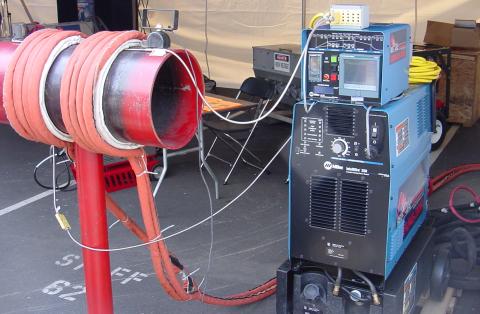This phenomenon is so pronounced that it is often exploited as a means of heating ferrous (iron-containing) materials. The photograph of (Figure below) shows an “induction heating” unit raising the temperature of a large pipe section. Loops of wire covered by high-temperature insulation encircle the pipe's circumference, inducing eddy currents within the pipe wall by electromagnetic induction. In order to maximize the eddy current effect, high-frequency alternating current is used rather than power line frequency (60 Hz). The box units at the right of the picture produce the high-frequency AC and control the amount of current in the wires to stabilize the pipe temperature at a pre-determined “set-point.”