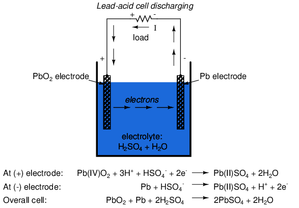 In the common "lead-acid" cell (the kind commonly used in automobiles), the negative electrode is made of lead (Pb) and the positive is made of lead (IV) dioxide (Pb02), both metallic substances. It is important to note that lead dioxide is metallic and is an electrical conductor, unlike other metal oxides that are usually insulators. (note: Table below) The electrolyte solution is a dilute sulfuric acid (H2SO4 + H2O). If the electrodes of the cell are connected to an external circuit, such that electrons have a place to flow from one to the other, lead(IV) atoms in the positive electrode (PbO2) will gain two electrons each to produce Pb(II)O. The oxygen atoms which are “left over” combine with positively charged hydrogen ions (H)+to form water (H2O). This flow of electrons into into the lead dioxide (PbO2) electrode, gives it a positive electrical charge. Consequently, lead atoms in the negative electrode give up two electrons each to produce lead Pb(II), which combines with sulfate ions (SO4-2) produced from the disassociation of the hydrogen ions (H+) from the sulfuric acid (H2SO4) to form lead sulfate (PbSO4). The flow of electrons out of the lead electrode gives it a negative electrical charge. These reactions are shown diagrammitically below:[DOE]