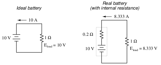 The real battery shown above within the dotted lines has an internal resistance of 0.2 Ω, which affects its ability to supply current to the load resistance of 1 Ω. The ideal battery on the left has no internal resistance, and so our Ohm's Law calculations for current (I=E/R) give us a perfect value of 10 amps for current with the 1 ohm load and 10 volt supply. The real battery, with its built-in resistance further impeding the flow of electrons, can only supply 8.333 amps to the same resistance load.