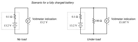 Notice how much better the battery's true condition is revealed when its voltage is checked under load as opposed to without a load. Does this mean that its pointless to check a battery with just a voltmeter (no load)? Well, no. If a simple voltmeter check reveals only 7.5 volts for a 13.2 volt battery, then you know without a doubt that its dead. However, if the voltmeter were to indicate 12.5 volts, it may be near full charge or somewhat depleted -- you couldn't tell without a load check. Bear in mind also that the resistance used to place a battery under load must be rated for the amount of power expected to be dissipated. For checking large batteries such as an automobile (12 volt nominal) lead-acid battery, this may mean a resistor with a power rating of several hundred watts.