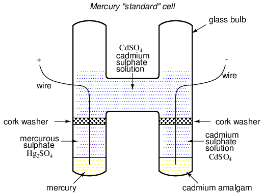 Back in the early days of electrical measurement technology, a special type of battery known as a mercury standard cell was popularly used as a voltage calibration standard. The output of a mercury cell was 1.0183 to 1.0194 volts DC (depending on the specific design of cell), and was extremely stable over time. Advertised drift was around 0.004 percent of rated voltage per year. Mercury standard cells were sometimes known as Weston cells or cadmium cells.