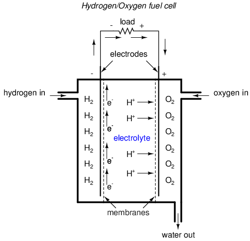 A fascinating device closely related to primary-cell batteries is the fuel cell, so-called because it harnesses the chemical reaction of combustion to generate an electric current. The process of chemical oxidation (oxygen ionically bonding with other elements) is capable of producing an electron flow between two electrodes just as well as any combination of metals and electrolytes. A fuel cell can be thought of as a battery with an externally supplied chemical energy source.