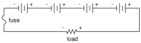 On this same theme, we must be sure that any overcurrent protection (circuit breakers or fuses) are installed in such a way as to be effective. For our series battery bank, one fuse will suffice to protect the wiring from excessive current, since any break in a series circuit stops current through all parts of the circuit: