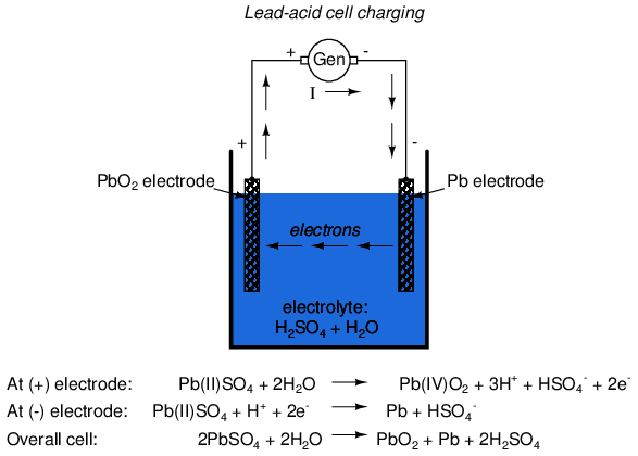 When a lead-acid cell is charged by an external current source, the chemical reactions experienced during discharge are reversed: