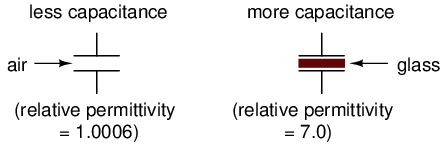 DIELECTRIC MATERIAL: All other factors being equal, greater permittivity of the dielectric gives greater capacitance; less permittivity of the dielectric gives less capacitance.