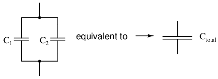 When capacitors are connected in parallel, the total capacitance is the sum of the individual capacitors' capacitances. If two or more capacitors are connected in parallel, the overall effect is that of a single equivalent capacitor having the sum total of the plate areas of the individual capacitors. As we've just seen, an increase in plate area, with all other factors unchanged, results in increased capacitance.