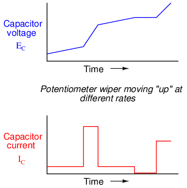 Note how that at any given point in time, the capacitor's current is proportional to the rate-of-change, or slope of the capacitor's voltage plot. When the voltage plot line is rising quickly (steep slope), the current will likewise be great. Where the voltage plot has a mild slope, the current is small. At one place in the voltage plot where it levels off (zero slope, representing a period of time when the potentiometer wasn't moving), the current falls to zero.